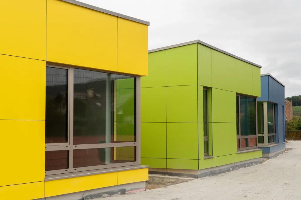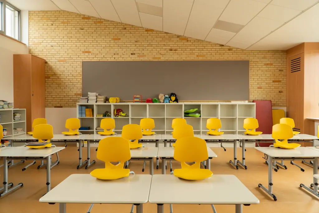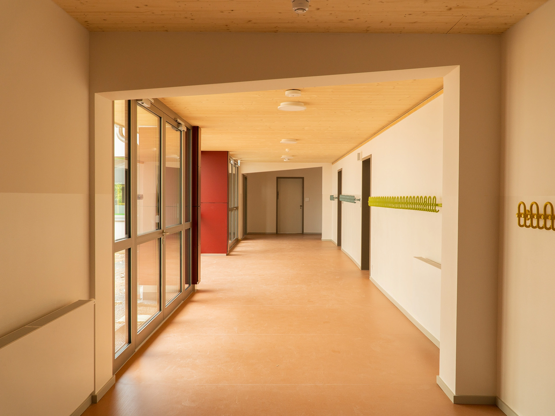 Farblich unterschiedliche Akzente in den Klassenräumen strukturieren den Bau und erleichtern die Orientierung innerhalb des Gebäudes.