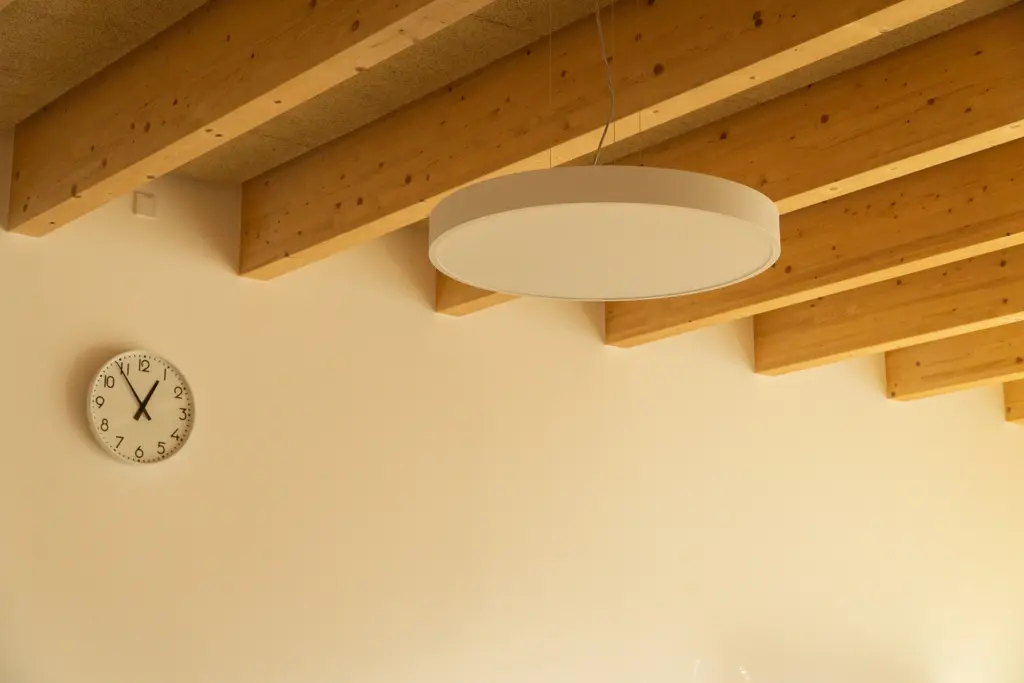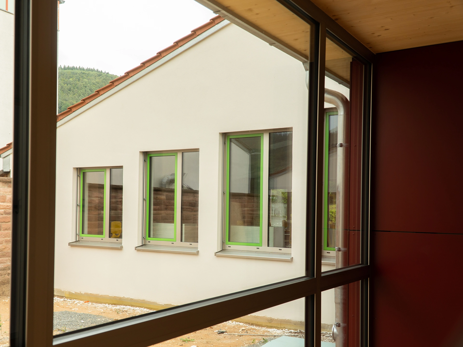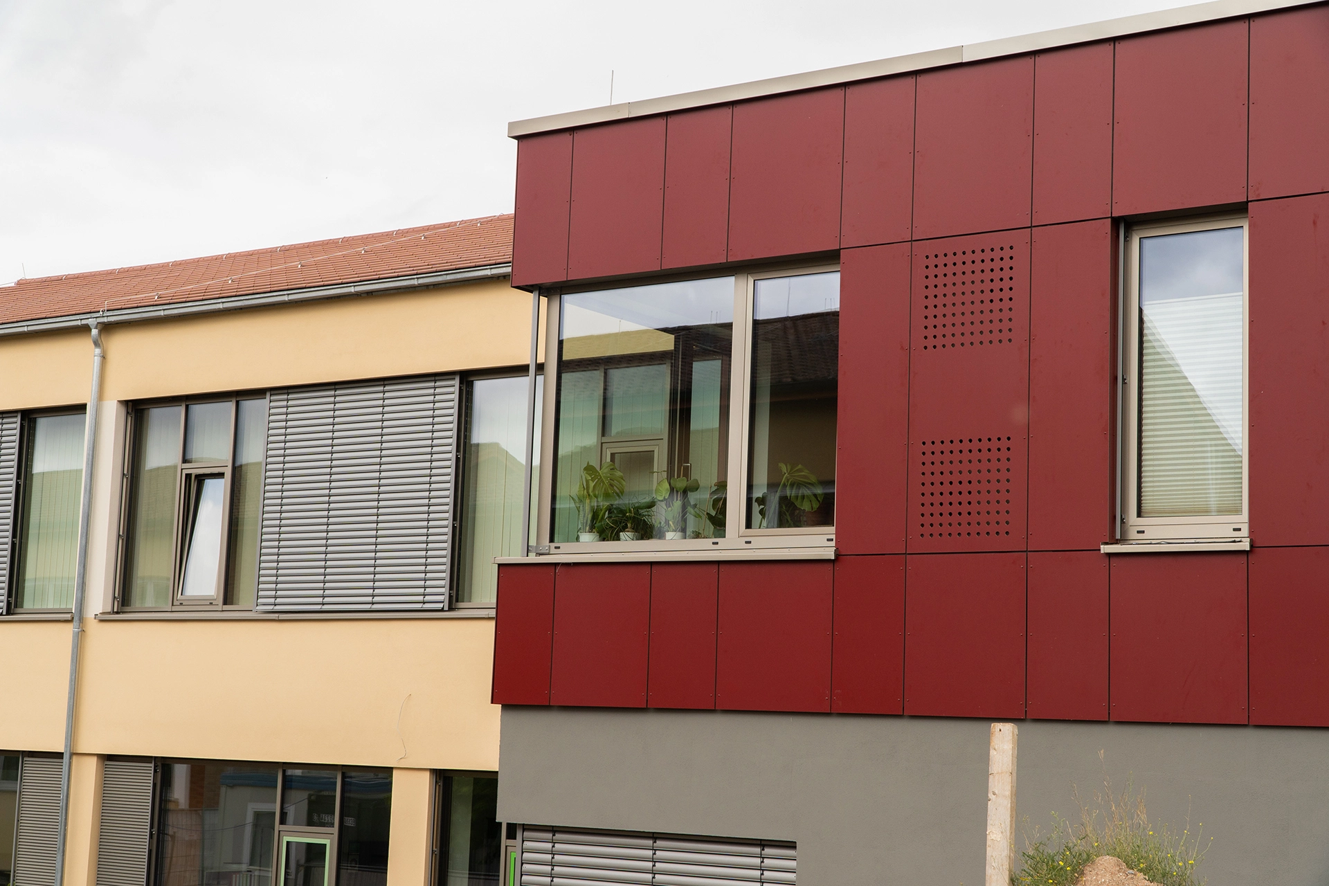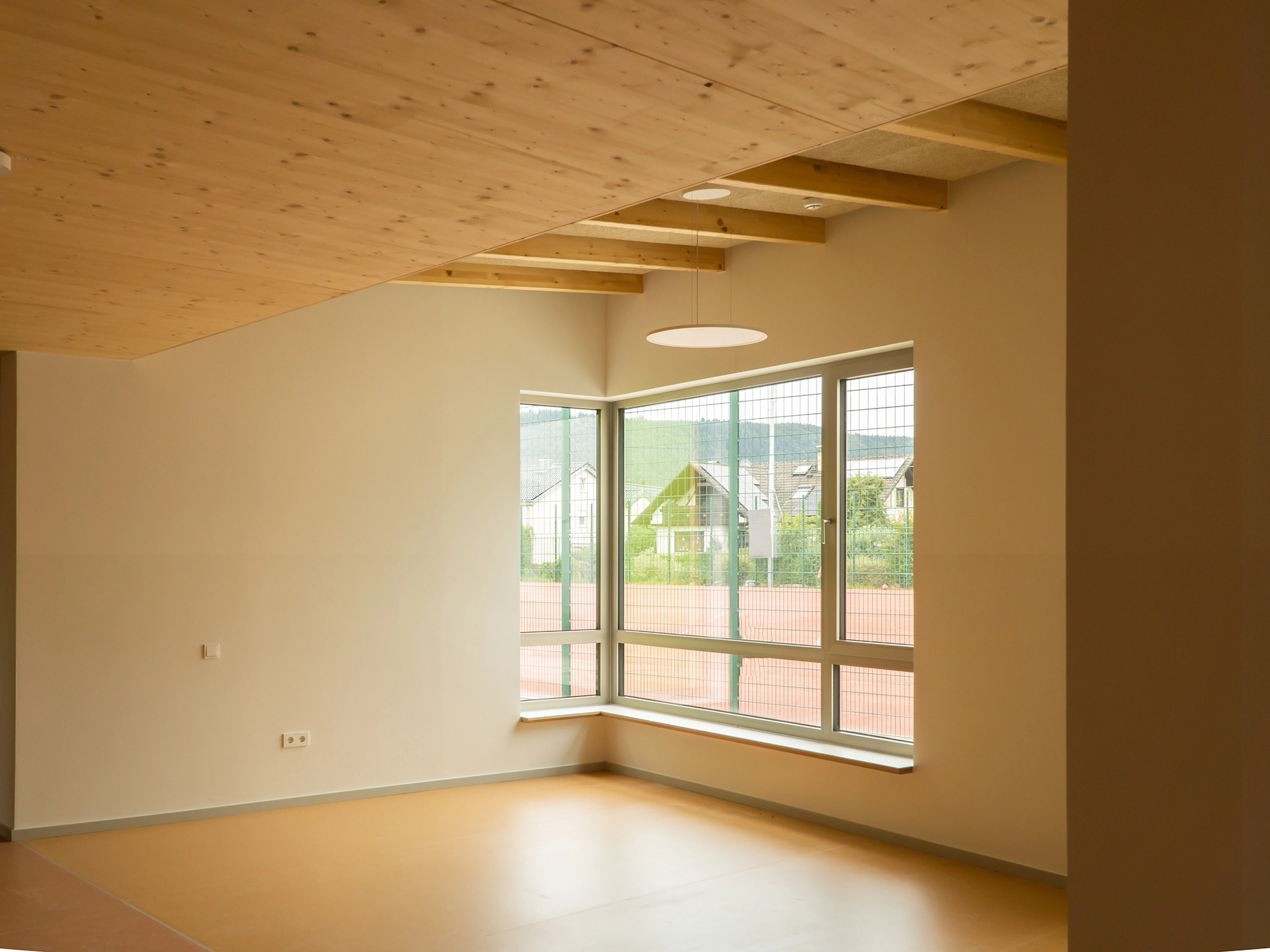 Der erste Bauabschnitt wurde im August 2022 fertiggestellt. Er umfasst den Mensa-, Aula- und Lehrerbereich und beinhaltet sowohl Umbaumaßnahmen im Bestand als auch neue Zwischenbauten in Holzbauweise, die die einzelnen Gebäudeteile funktional und gestalterisch miteinander verbinden.