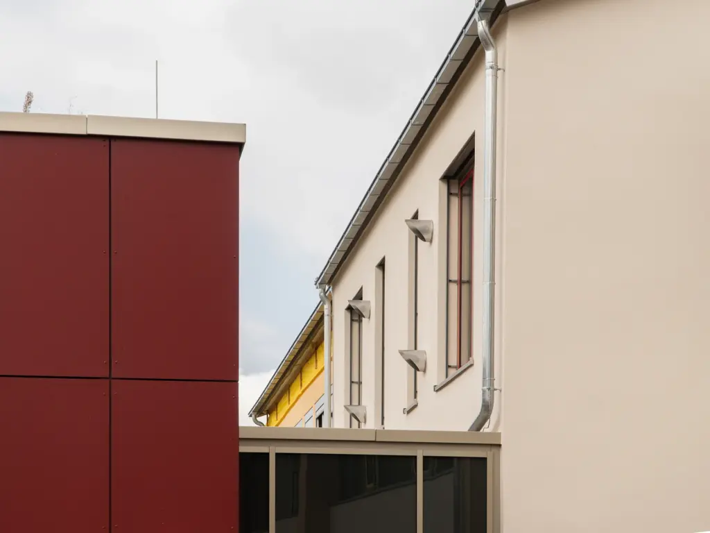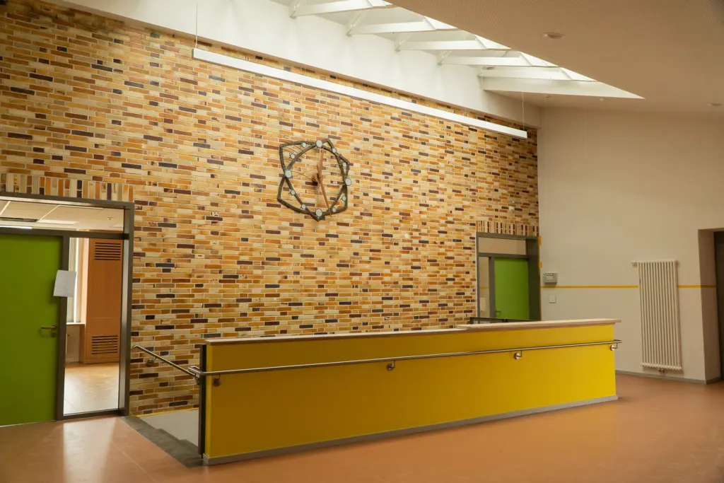 Ziel des gestalterischen Konzepts ist es, eine warme und einladende Atmosphäre zu schaffen. Die baulichen Merkmale des Altbestands, wie der rotweiße Bundsandstein und die sichtbaren Klinkerwände, erhalten einen Teil des ursprünglichen Charakters und integrieren sich in das neue Gesamtbild.