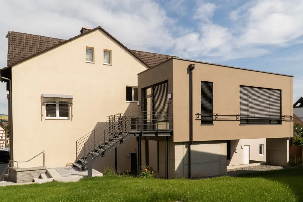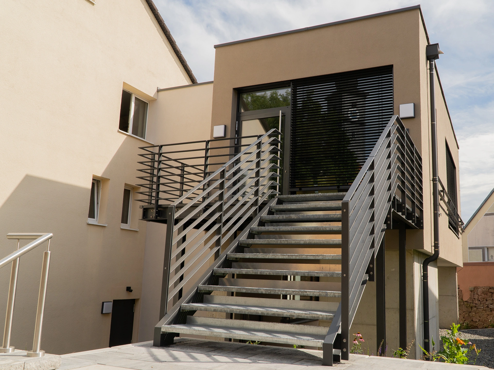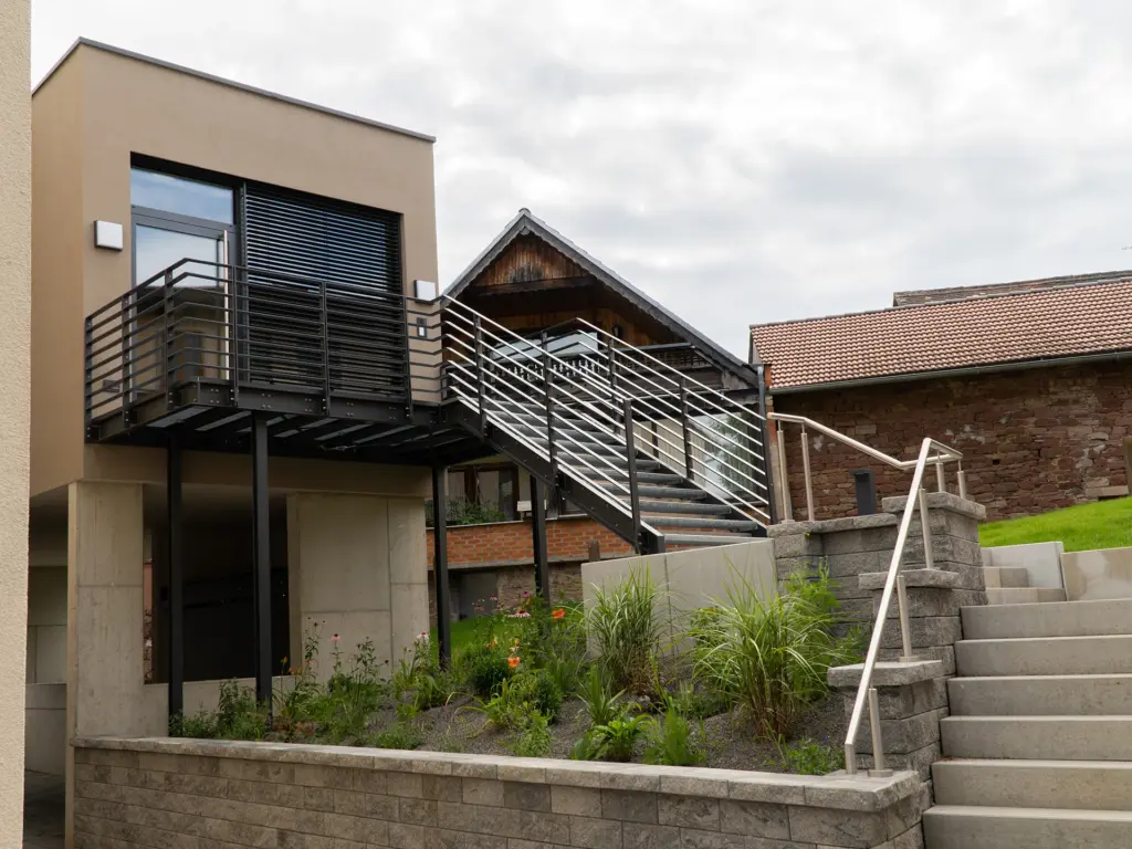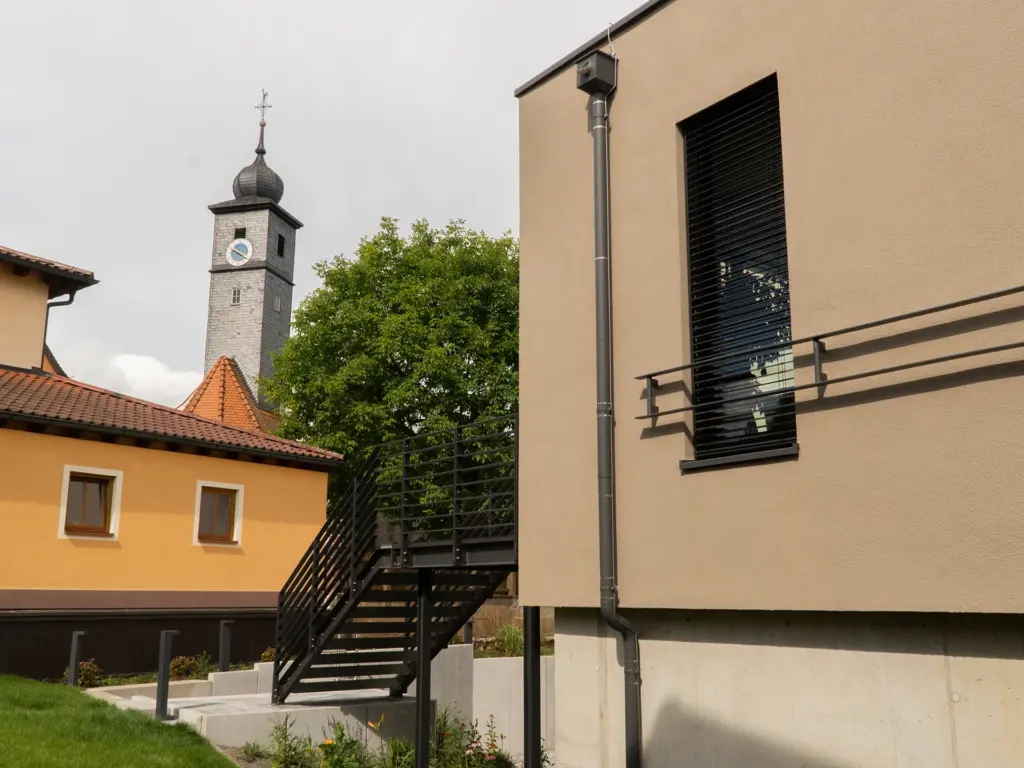 Der Zugang ist über eine Außentreppe, aber auch über den Außenaufzug möglich. Barrierefreiheit und die brandschutztechnische Anforderung an einen zweiten Rettungsweg werden durch diese Erschließungsmaßnahmen gewährleistet.