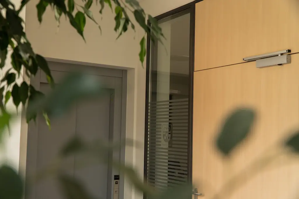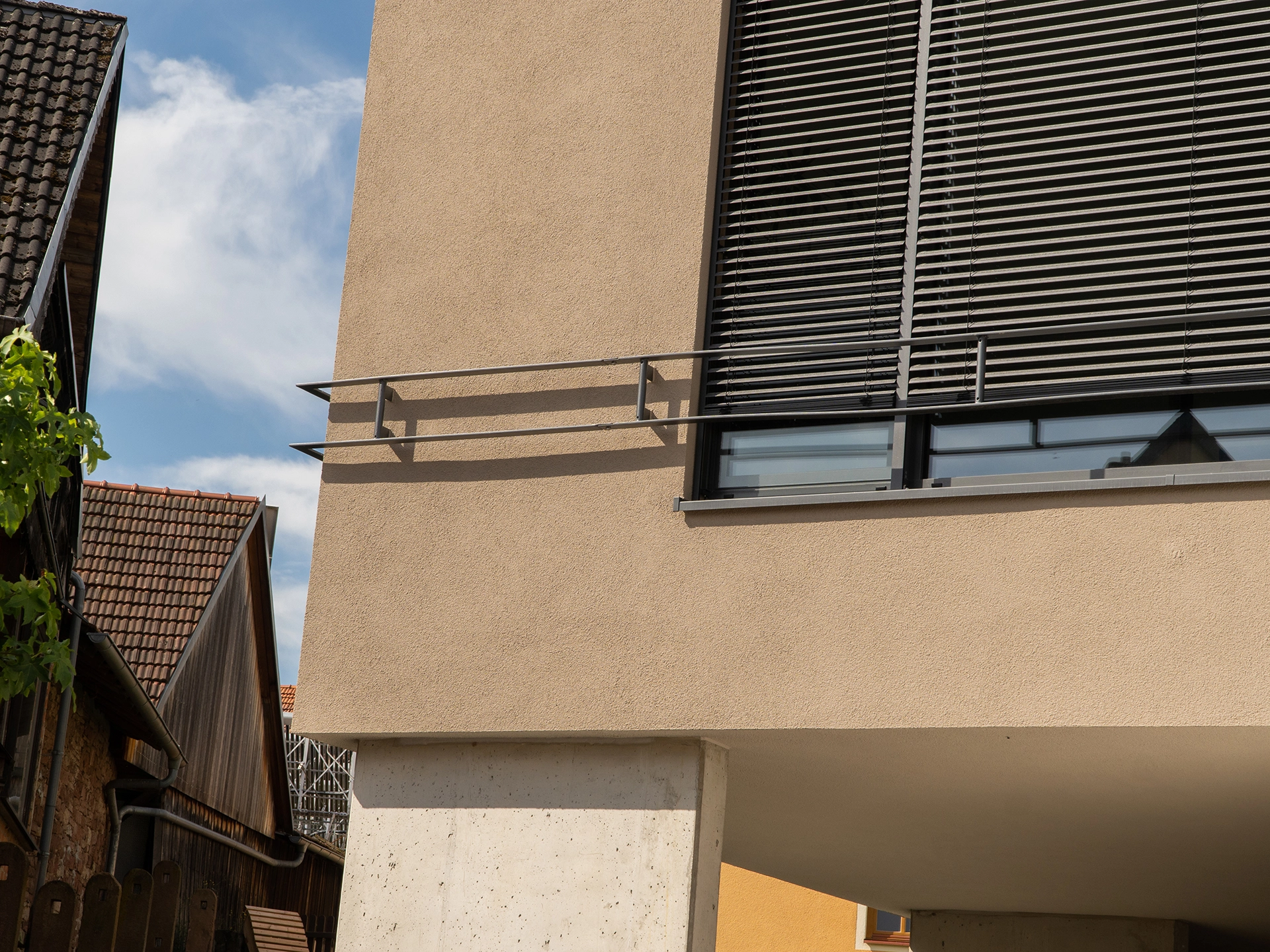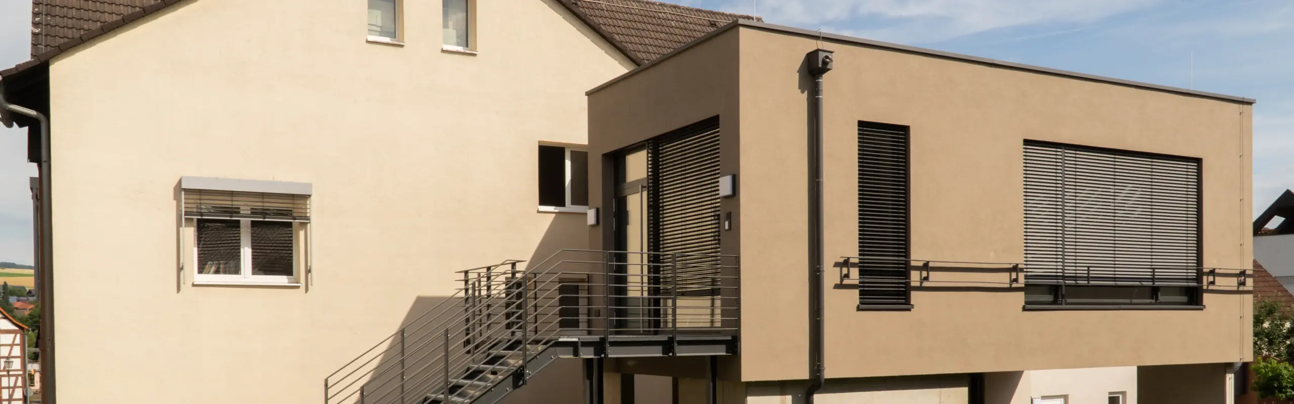 Der Zugang ist über eine Außentreppe, aber auch über den Außenaufzug möglich. Barrierefreiheit und die brandschutztechnische Anforderung an einen zweiten Rettungsweg werden durch diese Erschließungsmaßnahmen gewährleistet.