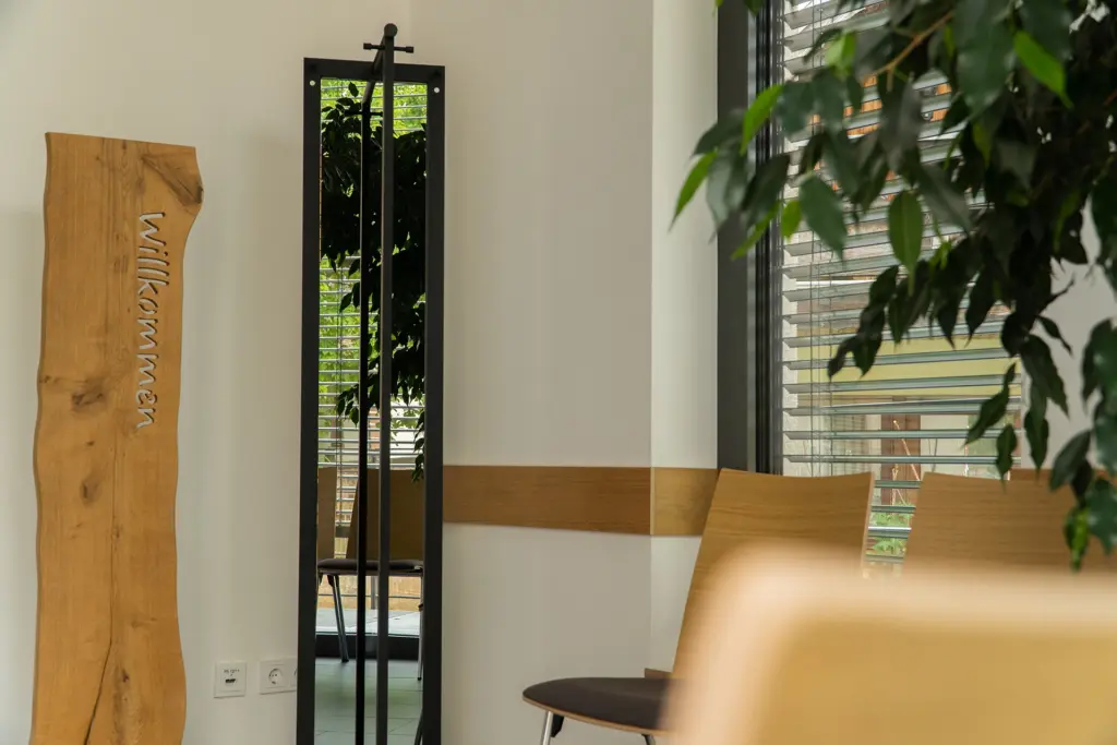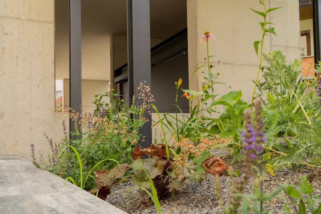 Die Gestaltung der bislang nicht genutzten Grünfläche, durch die Integration von Sitzmöglichkeiten und Bepflanzungen, erhöht die Aufenthaltsqualität auch im Außenbereich.