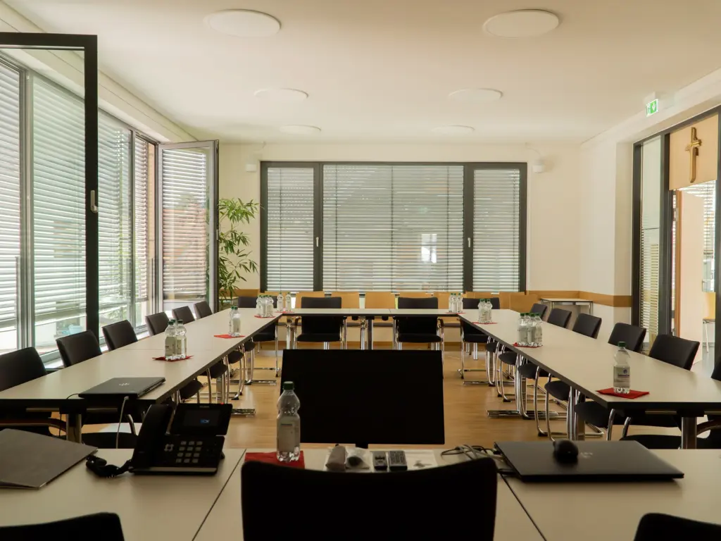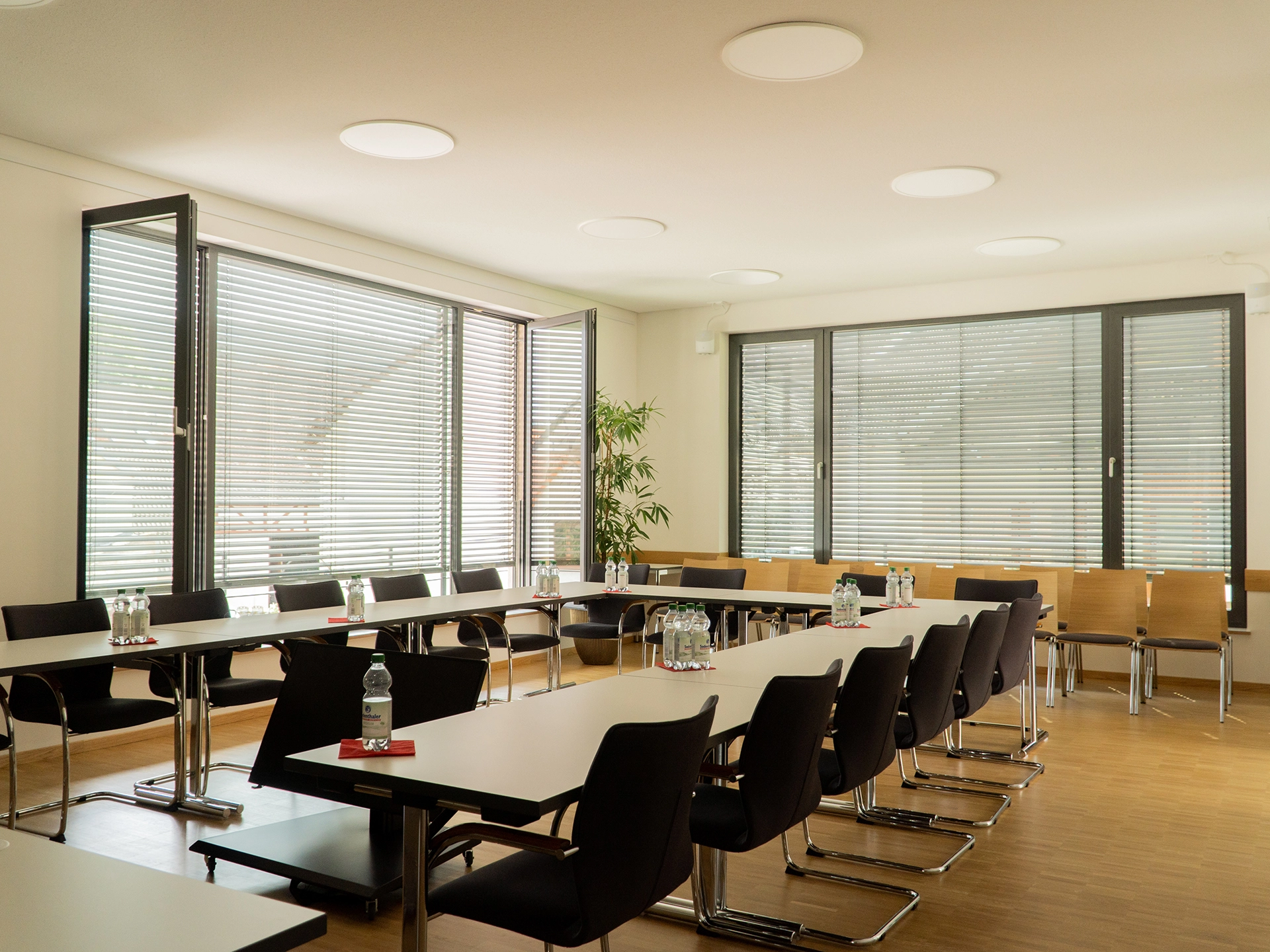 Aufgrund der vorhandenen Bebauungen, gliedert sich der neue Sitzungssaal im rückwertigen Bereich an das Rathaus an. Durch die An- und Umbaumaßnahmen sind insgesamt fünf neue Büroarbeitsplätze und ein neuer großräumiger Sitzungssaal mit moderner, multifunktionaler Informationstechnik entstanden.